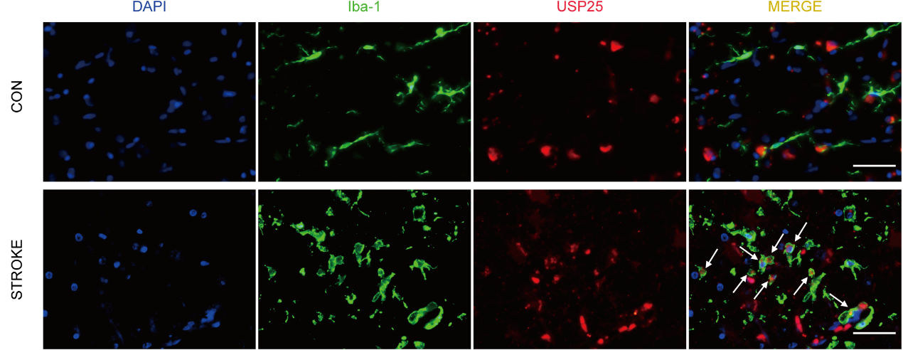 This study found that compared with normal microglia, USP25 expression was upregulated in microglia in the ischemic penumbra of ischemic stroke patients and mice, suggesting that USP25 inhibits neuroinflammatory responses through stress-induced upregulation after ischemic stroke.